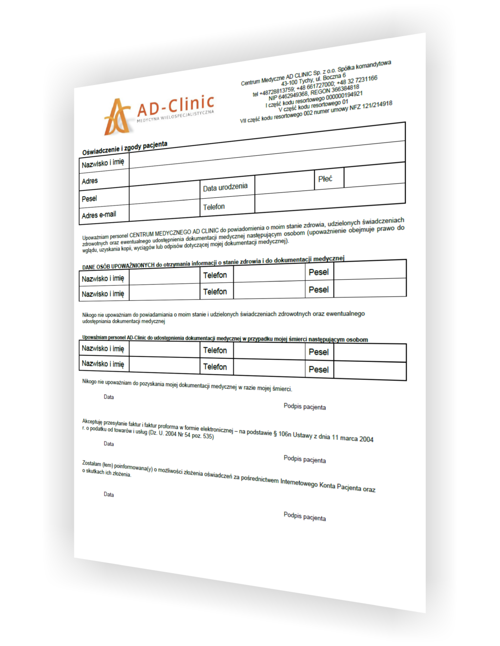 „Oświadczenie i zgody pacjenta” to dokument umożliwiający udostępnienie informacji medycznych bliskim lub wskazanym przez nas osobom (lub zastrzeżenie tego). Na drugiej stronie znajduje się zgoda na przetwarzanie danych osobowych i zgoda na udzielenie świadczeń medycznych. Prosimy o wypełnienie i dostarczenie w/w formularza przed rozpoczęciem badań w celu umożliwienia świadczenia przez nas usług.